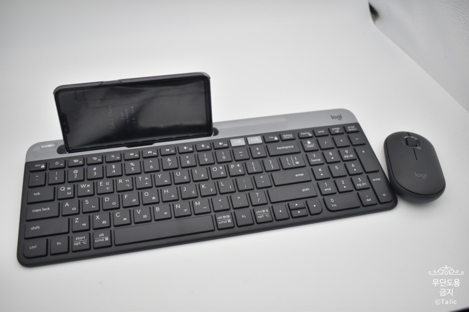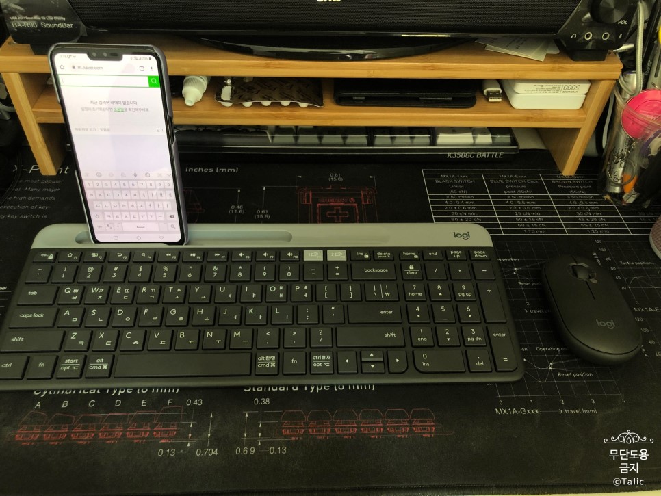 키보드 상단 좌측에 거치대가 있기에 위와 같이 스마트폰을 가로로 거치 할 수도 있고, 필요에 따라선 세로로도 거치를 할 수 있습니다. 크기는 스마트폰 크기로 되어있지만 작은 태블릿 PC도 세로로는 거치가 가능합니다.